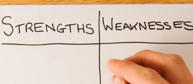 #1 Para começar, faça duas colunas numa folha de papel. De um lado ficarão seus pontos fortes: aquilo em que você é bom, no que se destaca e causa de elogios. Do outro, os pontos fracos: o que atrapalha sua performance, do que sente falta e dicas de melhoria que já recebeu.