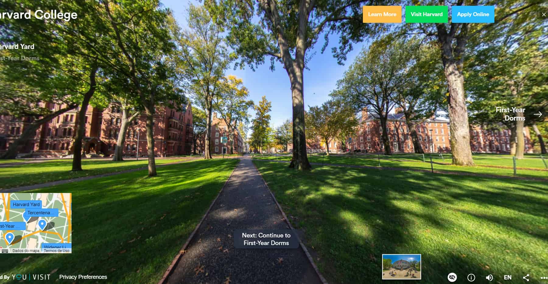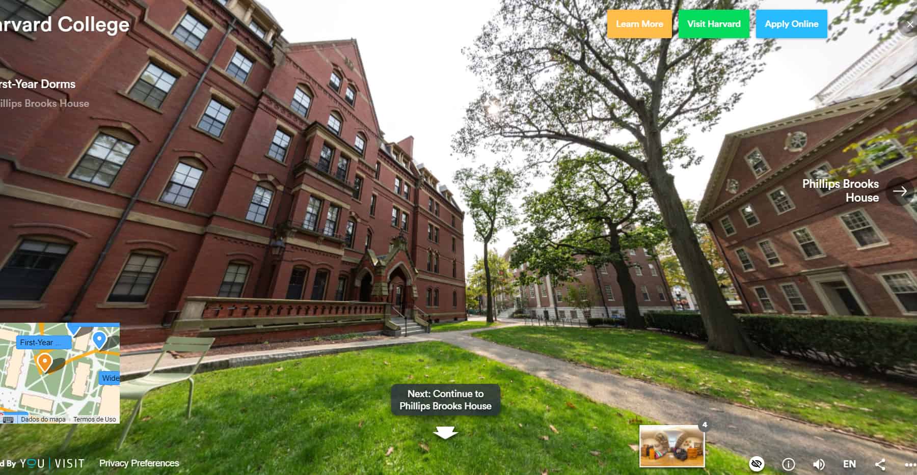 Antes da pandemia de Covid-19, algumas das instituições mais renomadas do mundo já ofereciam a opção de tour virtual pelos campi para que os estudantes pudessem ter contato com o ambiente universitário antes da etapa de application – o modelo de processo seletivo norte-americano. Algumas faculdades oferecem visitas presenciais para os estudantes candidatos, porém, com a situação sanitária imposta, construir um campus virtual foi fundamental.